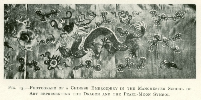 FIG. 15.PHOTOGRAPH OF A CHINESE EMBROIDERY IN THE MANCHESTER SCHOOL OF ART REPRESENTING THE DRAGON AND THE PEARL-MOON SYMBOL