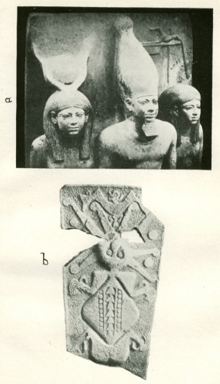 Fig. 21.(a) A slate triad found by professor G. A. Reisner in the temple of the Third Pyramid at Giza. it shows the pharaoh Mycerinus supported on his right side by the goddess Hathor, represented as a woman with the moon and the cow's horns upon her head, and on the left side by a nome goddess, bearing upon her head the jackal-symbol of her nome.