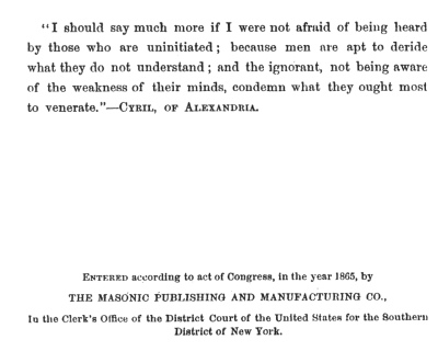 "I should say much more if I were not afraid of being heard by those who are uninitiated; because men are apt to deride what they do not understand; and the ignorant, not being aware of the weakness of their minds, condemn what they ought most to Venerate."—CYRIL, OF ALEXANDRIA.