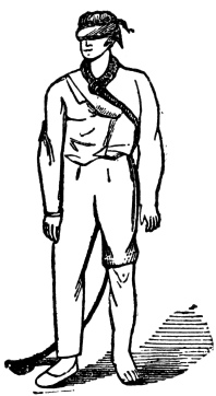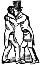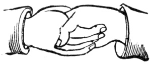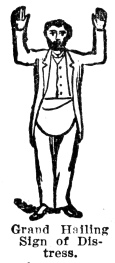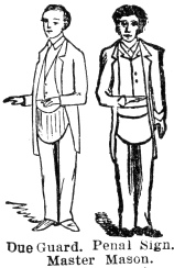 The Penal Sign is given by putting the right hand to the left side of the bowels, the hand open, with the thumb next to the belly, and drawing it across the belly, and letting it fall; this is done tolerably quick. This alludes to the penalty of the obligation: "Having my body severed in twain," etc. See page 75. After the Master has given the sign and due guard, which does not take more than a minute. he says, "Brother, I now present you with my right hand, in token of brotherly love and affection, and with it the pass-grip and word."