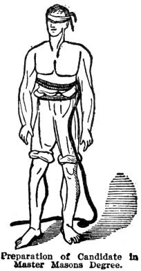 Preparation of Candidate Master Mason's Degree.—He is conducted into the preparation room as in the preceding degree. All his clothing is removed as before; both legs of the drawers are tucked up above the knees, both sleeves of the shirt are tucked up above the elbows, both breasts of the shirt are turned, making both breasts bare. The hoodwink is again fastened over both eyes and the cable-tow is put three times around his body. No slipper is used in this degree. Should the shirt be closed in front, it must be taken off or turned front backwards, as both breasts must be bare. An apron is then tied on and worn as a Fellow Craft, and thus he is "duly and truly prepared."
