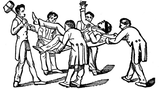 Candidate as Hiram Abiff falling into the Canvas, having been struck in the forehead by the setting maul of the supposed third ruffian, Jubelum.
