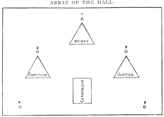 This diagram represents an elevated stage. 1, Commander; 2, Generalissimo; 3, Captain General; 4, Prelate; 5, Commander of the deceased Knight's commandery.