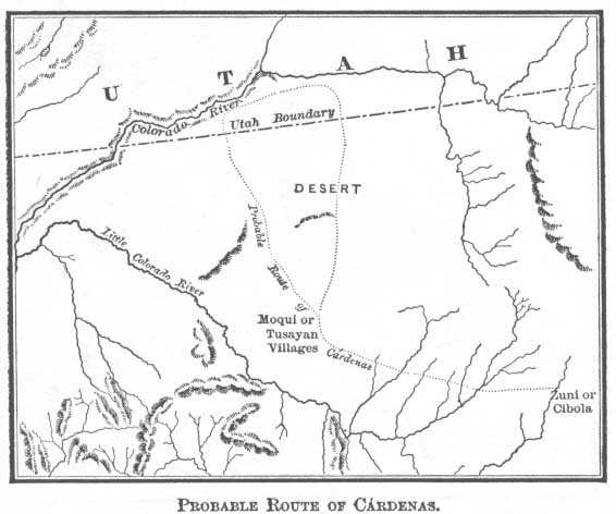 chronicle the expedition. Obtaining at Tusayan, where he was well received, guides and carriers, with an ample supply of provisions, Cárdenas marched for twenty days, probably in a north-westerly direction, 1
