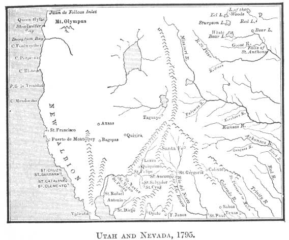 If the intention was, as Bonneville asserts, that this party should pass round the great lake, in their endeavor they presently found themselves in the midst of desolation, between wide sandy wastes and broad brackish waters; and to quench their thirst; they hastened westward where bright snowy mountains promised cooling streams. The Ogden River 11 region being to them so new, and the thought of California so fascinating, they permitted themselves to stray from original intentions, and cross the Sierra Nevada to Monterey. All that is known of their doings before reaching the Snowy Range is given in my History of Nevada, and their exploits after reaching California are fully narrated in that part of this series devoted to the history of the latter country. 12