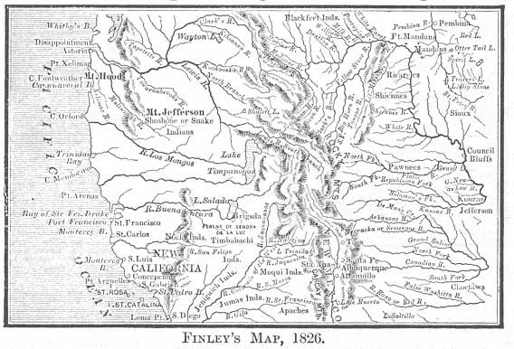 29:13 'Previous to setting out,' says Bidwell, California, 1841-8, MS., 24-5, 'I consulted maps so as to learn as much as possible about the country…As for Salt Lake, there was a large lake marked in that region, but it was several hundred miles long from north to south, with two large rivers running from either end, diverging as they ran west, and entering the Pacific Ocean.' it was Finley's map of North America, 1826, herein reproduced, which he alludes to. 'My friends in Missouri advised me to bring tools, and in case we could not get through with our wagons to build canoes and go down one of these rivers.' The region to the west of Salt Lake was indeed a terra incognita to these explorers.