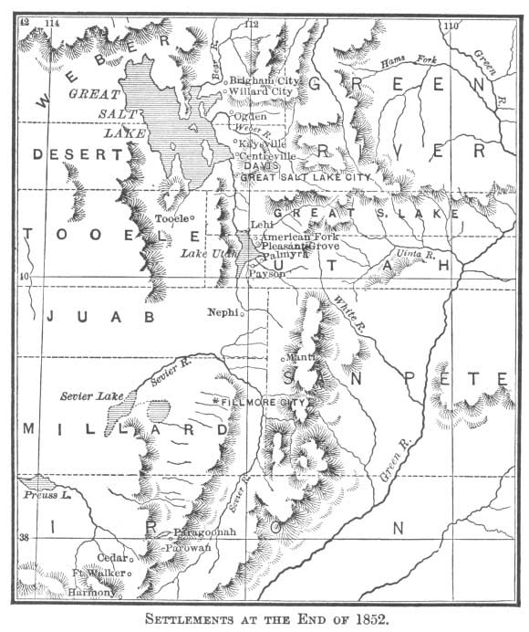 Founding of Centreville—Bountiful—Ogden—Lynne—Easton—Marriotsville—San Pete—Provo—Indian War—Walled Cities—Evansville—Lehi—Battle Creek—Pleasant Grove—American Fork—Payson—Nephi—Manti—Chief Walker—Fillmore—Site Chosen for the Capital—Tooele—Grantsville—Kaysville—Little Salt Lake—Parowan—Cedar City—Paragoonah—Forts Walker and Harmony—Box Elder Creek—Brigham City—Willard City—San Bernardino in California.