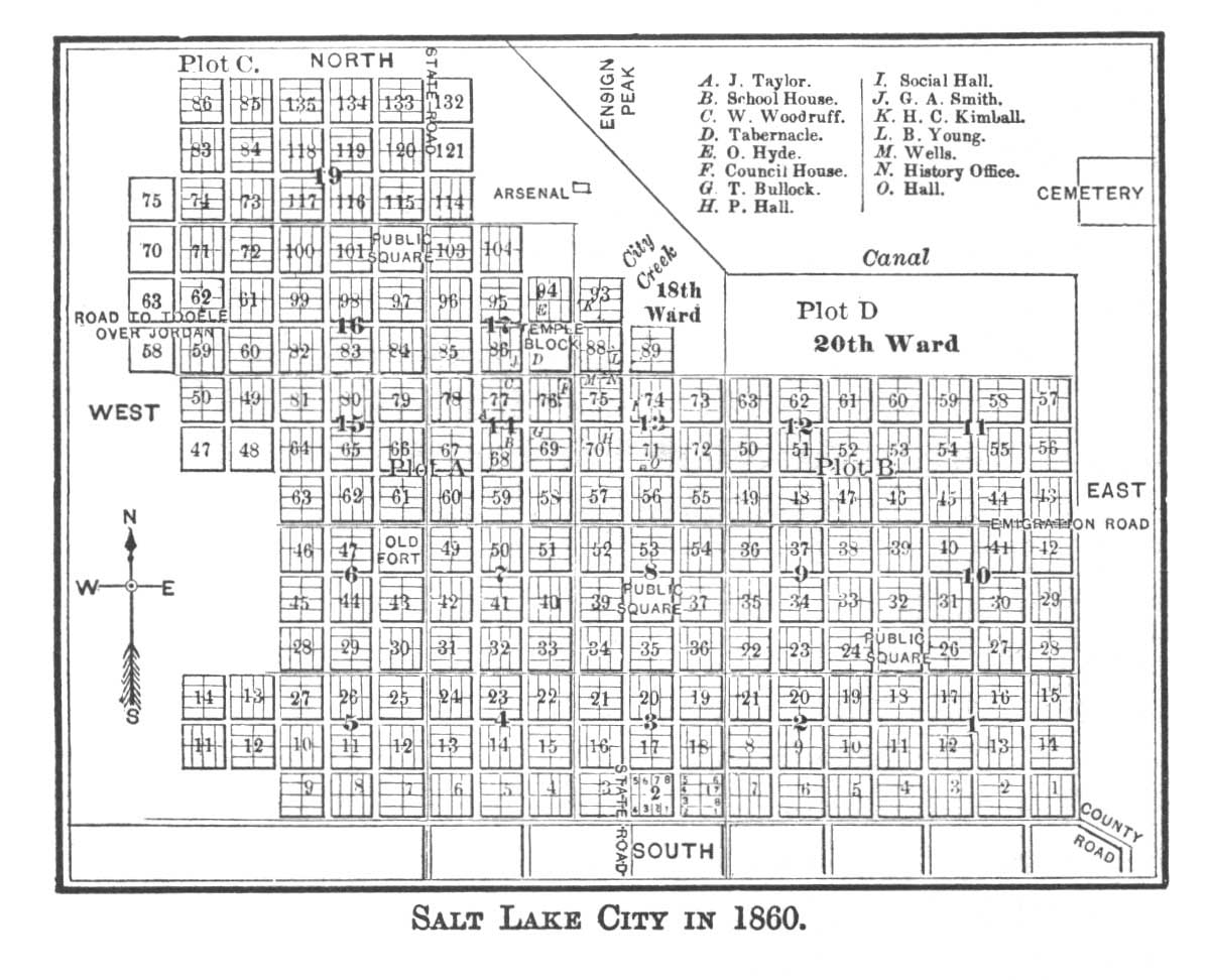 In the blocks adjacent to the tabernacle were the residences of Brigham, Heber, Orson Hyde, George A. Smith, Wilford Woodruff, John Taylor, and Daniel H. Wells, the first two occupying entire blocks. 27 South of temple block was the council-house, 28 south of Brigham's dwelling and adjoining that of Wells was the historian's office, where the church records were kept, and in the next plat to the east was the social hall, 29 where the fashion of the city held festivities.