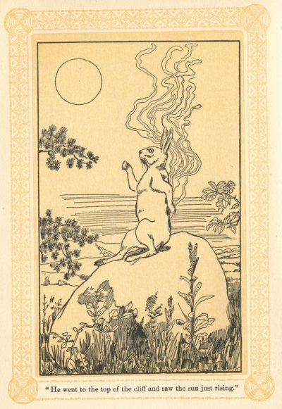 Meanwhile the sun came up and passed so close to the earth that it burnt his back full of holes. The Hare felt very sore; and as he rubbed himself, his fur came off in great patches, so that his beauty was spoiled. He was furiously angry, and starting up, cried out that he would fight the sun; and in spite of all that his friends could say, went at once in pursuit of him.