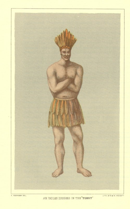 When the Captain sent out orders by the crier of the general council, for the Indians to go out in search of game, or seeds, one of the puplem, (signifying one who knows all things) sketched upon the ground in front of Chinigchinich, a very ridiculous figure, and the crier called upon all to go and worship it. Having congregated together, according to their custom on such occasions, (male and female) the men armed with their bows and arrows, and well painted--the chief and the puplem dressed in their appropriate costumes, resembling devils more than human beings--they went in succession, running one behind the other, led by their captain, until they arrived. opposite Chinigchinich, and the figure upon the earth. The leader then gave a jump, springing
