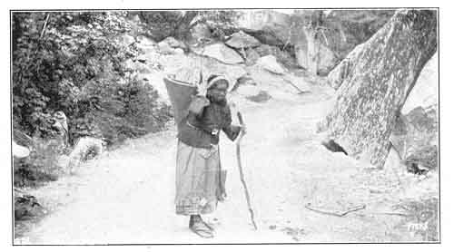 Tis-sa'-ack and her husband traveled from a far-off country, and entered the Valley footsore and weary, She walked ahead, carrying a great conical burden-basket, which was supported by a band across her forehead, and was filled with many things. He followed after, carrying a rude staff in his hand and a roll of woven skin blankets over his shoulder. They had come across the mountains and were very thirsty, and