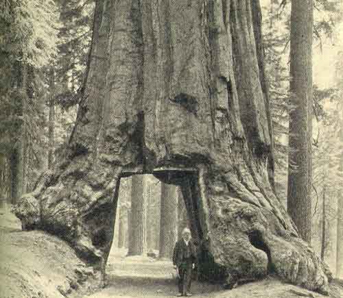 The Wawona tree, photographed and known throughout the world, with a ten-foot roadway cut through its base, is very unique, and here the visitor may linger for a picture to carry home in memory of the golden moments spent in this grove of majestic beauty.