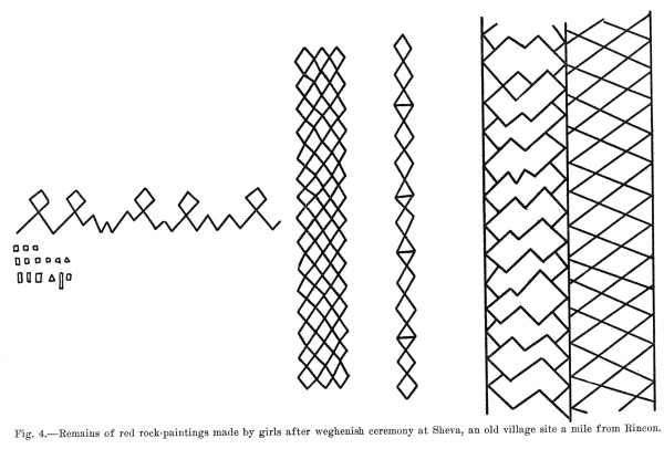 still be seen, especially near the old village sites, consist of geometrical arrangements of red lines, usually in patterns forming vertical stripes several feet high. (Fig. 4.) After making her painting, a girl was again free to eat meat and salt. The paintings were called yunish. 312