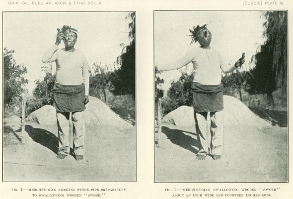 Plate 16 (referred to on page 80 as Pl. 1). Fig. 1.Medicine-man smoking stone pipe preparatory to swallowing wooden "sword." Fig. 2.Medicine-man swallowing wooden "sword" about an inch wide and fourteen inches long.