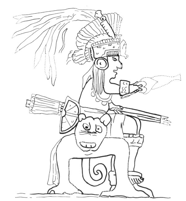FIG. 3--Mexican warrior occupying the jaguar-seat. Fresco, Temple of the Warriors, Chichen Itzá. (After Ann Axtell Morris.)