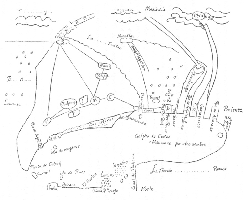 Tg: Land they call of war. EB: Straits of Bacalar. RT: Rivers of Tahiza. Los Y: The uninhabited part of Yucatan. BA: Baia de Ascension. Las atiras: The strips that traverse the length of the coast, Zilam, Kichal, Caukel and Alzibo. TV: Tavasco, villa de la Victoria. La Florida and its rivers and ports discovered as far as Pánuco.