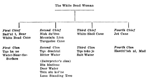 Now Hasjelti had planned how the monsters should be killed; how the White Bead Woman was to be formed; how the two dogs should be the guards of the people; and how the ceremonial people should dance. He planned the clan called Tat chee. The Tat chee people have fiery tempers, broad faces, and large heads.