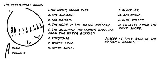 Sandoval sat on the floor. "Now begins the Night Chant of 'All is Well'" he said. He chanted and Sam, the interpreter, chanted with him. For them this was sacred. After the chant Sandoval passed his medicine pouch to Sam who took a pinch of pollen and placed it on his tongue and head and threw the remainder in the air to the east. I was told to do likewise. The pouch having been returned, Sandoval placed pollen on his tongue and head. He threw some into the air, sprinkling quite a bit over the manuscript. Then he prayed: