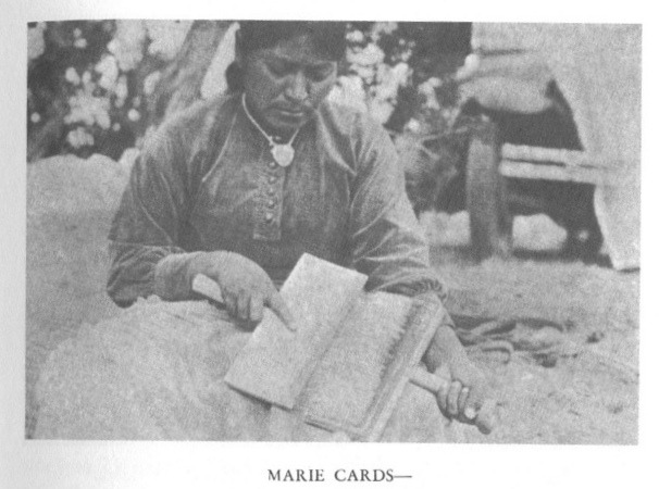 Marie tells me—for we have ample opportunity for conversation now—that not all women can spin, even though they are good weavers. They procure their yarn from friends, some of whom specialize in warp yarn, and others in weft. All, doubtless, know how to card, but it is not a favorite diversion. If carding cramps my hands, it is no different with theirs. They are more accustomed, but hands and shoulders become weary, for it is hard work. Besides it is dirty. Contrary to the common notion, wool is not usually cleaned before it is carded. Washing mats it and makes it difficult to card. The carding itself removes a great amount of dirt. Sand and other dirt loosened by the teeth of the towcards fall out of the wool. Before carding, it may be a yellow lumpy matted mass. It comes forth from the cards of an expert in a white fluffy shapely rectangular pad. I like wool in almost any state or form, but it is most attractive at this stage.