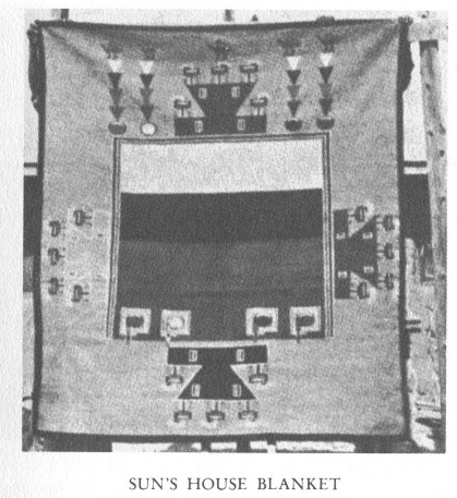 After staying an hour or so with Red-Point I proceed to Atlnaba's house. She has visited me briefly to see how I am coming along, but her own interest has reached a climax. For over a year she has been working on a large tapestry. Contrary to the usual custom whereby women weave the patterns in their heads or in their mind's eye, she is copying as accurately as she can the exact details of a framed sand-painting which stands on the ground resting against the post of her loomframe. It is one of Red-Point's paintings, the Sun's House. She has chosen to use a soft gray background. In the center a large portion consisting of four wide stripes of yellow, green, black, and white represents the Sun's House. Within the yellow stripe are the houses of Sun, Moon, Black Wind, and Yellow Wind, each with a snake as guardian and with a rainbow border. The center portion is surrounded by a rainbow of blue and red, each stripe outlined in white.