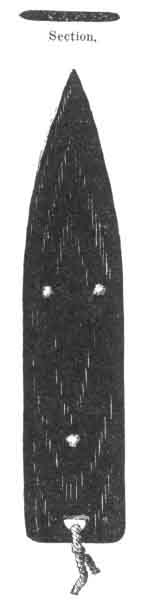 135. The instrument designated above as the whizzer is a thin, flat, pointed piece of wood, painted black and sparkling with the specular iron ore which is sprinkled on the surface; three small pieces of turquoise are inlaid in the wood to represent eyes and mouth. One whizzer which I examined was nine inches long, one and three-fourths inches broad, and about a quarter of an inch thick in the thickest part. (Fig. 56.) To it was attached a string about two feet long, by means of which the centrifugal motion was imparted to it. It is called by the Navajo tsín-¢e`ní`, or groaning stick. It is used among many tribes of the southwest in their ceremonies. The Navajo chanters say that the sacred groaning stick may only be made of the wood of a pine tree which has been struck by lightning.