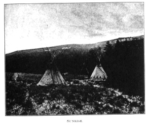he was feeding alone, too near the ghostly woods, and hurriedly joined his companions. Returning to the lodge, which looked most picturesque, lighted up by the golden glow from the fire within, and showing in clear outline the weird decorations on the canvas, and the tapering poles overhead, we turned into our comfortable blanket-beds beside the fire. The deep stillness of the night was broken by the mournful howl of a wolf in the forest close by. He was answered by another and then another, until they all united in a chorus of long howls. Siksikakoan said: "When the wolves howl like that, it is a sign of coming storm. This morning when the sun rose, I saw two large sun dogs in the eastern sky, that resembled enormous crosses, and at midday there was a huge circle around the sun,—nature's warning signs of a big storm."