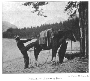 No pack horse outfit is complete without its Buckskin, distinguished alike for his colour and for his endurance and tractability. Our Buckskin was no exception. The hardest drives never seemed to tire him. At the day's finish he was still fresh and generally in the lead. After his long rest, Buck was feeling in fine trim and was eager for adventure. The chance soon came. His