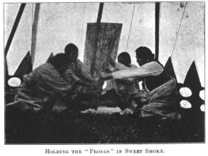 White Grass then pointed along the ground towards my seat, a sign that he had finished. Bear Child arose and taking the prongs, picked out a live coal from the embers and laid it in front of O-mis-tai-po-kah, the head chief. Placing dried sweet grass upon the coal and holding both hands in the rising smoke, he prayed:—