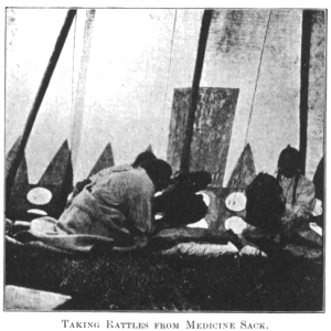 The Rattle songs came next, all uniting in the song, "The rattles I hold are good." This was repeated four times. The priests then grasped the rattles and beat rhythmically upon the buffalo raw hide, singing in unison "I now take the rattles." I watched every movement Mad Wolf made and when he grasped the rattles and began beating, I did likewise and also joined vigorously