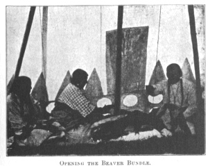 The two sacred women knelt beside the Bundle, imitating the actions of the buffalo and representing the buffalo bull, or chief, slowly approaching the Beaver Bundle. He stopped three times before reaching it. At the fourth time, the women imitated the Buffalo Chief, hooking at the Bundle with his horns. Mad Wolf chanted the Hurrying song and then the String song, as the women untied the strings and removed the outside cover, revealing a beautiful beaver skin called in their ceremonial "His Robe." The song was changed to a solemn chant led by Mad Wolf, while