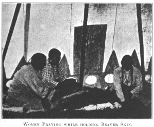 WOMEN PRAYING WHILE HOLDING BEAVER SKIN.