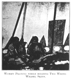 WOMEN PRAYING WHILE HOLDING TWO WHITE-WEASEL SKINS.