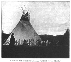 While the rest were feasting, I saw Awunna, a kindhearted old priest and doctor, gathering together a supply of food. Before tasting anything himself, he carried it to his wife, E-kit-o-waki, one of the old women who had been dancing outside the lodge. They were an interesting couple. He always seemed thoughtful of others and in a good humour, while E-kit-o-waki, his wife, was still full of fun and life. Before the ceremonial began I saw Awunna draw her to one side and gently placing his hands upon her, uttered a prayer giving her his blessing. This was because she was about to enter Bear Child's lodge to doctor a sick child.