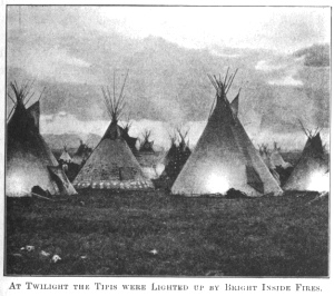 either side and extending to the zenith, formed a magnificent "sun-burst," with Mount Rising Wolf for its centre. Later in the deepening twilight the great cluster of Indian lodges showed a ghostly white against the darkening blue of the eastern sky. When the tipis were lighted by bright inside fires, the circular encampment looked like an enormous group of coloured