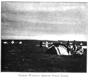 [paragraph continues] They walked once around the sweat lodge and Gives-to-the-Sun took her seat on the west side. She sat smoking and praying, while the priests, with their helpers the Mad Dogs, stood on the south side. A hole was dug inside the sweat lodge to receive the heated stones. The earth was carefully placed on one side, because it symbolised the earth thrown up by the