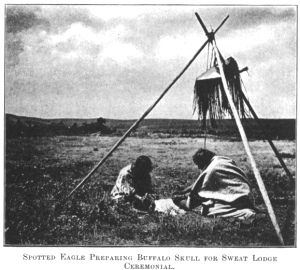 SPOTTED EAGLE PREPARING BUFFALO SKULL FOR SWEAT LODGE CEREMONIAL.