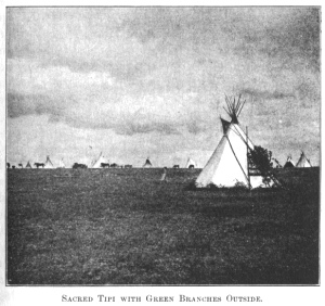 During the prayer of the head chief, all heads were reverently bowed, and at the close they joined earnestly in an Amen. While inside the sacred tipi, I took part in the ceremony, beating time with my rattles and joining with the priests in the solemn chants.