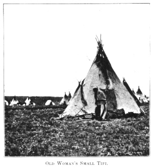 fastened to the horn of his saddle, would start off at a gallop. The tipi would be jerked from its fastenings, the old woman would be startled from her slumber by the disappearance of her home, as if struck by a hurricane, and she would be left sitting up among her