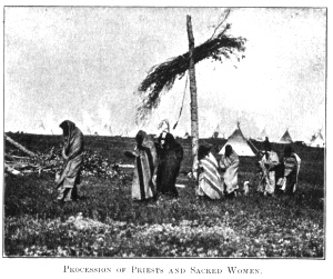 Ceremonial of painting Mad Wolf and clothing the sacred woman.—The priests and sacred women appear before the tribe.—The Feast of Tongues.—Making vows in behalf of the sick.—Awasaki's prayer for her grandchildren.—Ceremonial of "Cutting the hide."—Warriors assemble according to clans.—They march holding long poles aloft.—The tribe sing the Hymn to the Pole in unison.—An impressive scene.—The priests and sacred women bless the Centre Pole.—The warriors raise the pole and complete the Sun-lodge.—Points of resemblance in the Feast of Tongues to feasts of the Jewish and Christian Churches.