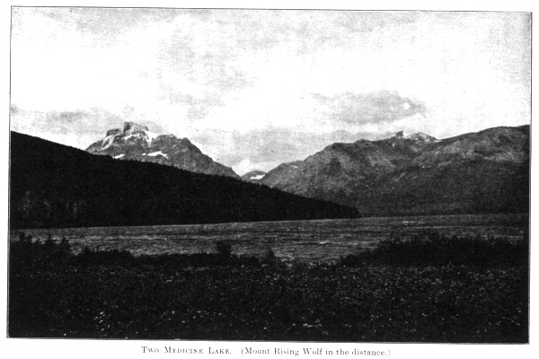 IN the early summer of 1905, I was in camp with Kionama and Onesta on Two Medicine Lake in northern Montana. The sun had set behind Mount Rising Wolf. The rugged summits of the Rockies were silhouetted in sharp outlines against the golden light, which still lingered in the western sky. The distant snow-capped peaks, the intervening forest-covered ridges and the silver crescent of the new moon hanging over all, were reflected in the quiet lake. Menake and Nitana, their wives, were busily engaged preparing our evening meal, over an outside fire. They were, at the same time, taking a prominent part in discussing with their husbands a proposed trip across the border into Canada, to visit relatives and friends among the northern divisions of the Blackfeet.