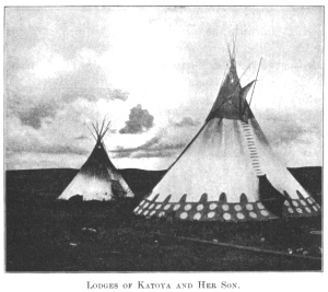 Katoya continued in a reminiscent mood, "I was seven years old when I became the wife of Screaming Owl. I lived with him until death separated us. During our married life I gave the Sun ceremonial three times; the first, when I was fourteen years of age. The vow for our last Sun-dance was made by my son, Pakapse, when he was living on Badger Creek. I had been very sick, and some one brought to him word that I was dying. It was night when he received the message, and the moon was in the sky. He had always before prayed to the Sun, but, that night,