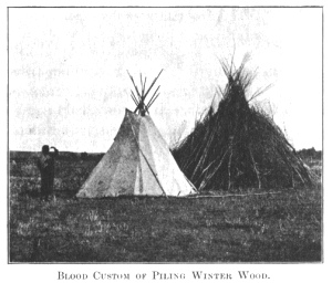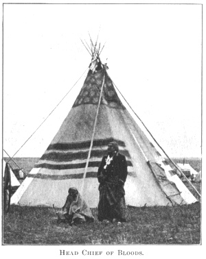 WE remained several days in the Blood camp to rest our horses and visit Indian relatives and friends. The Bloods are a fine looking tribe, but reserved and haughty. They seem to be on the best of terms with the North Blackfeet, but are not popular with other tribes, because of their conceit and arrogance. The Piegans have a saying, "He is just like a Blood, he likes to show off." They also speak of the Bloods as "generous givers, but always seeking to get back as large a return as possible."