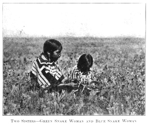 away from there, Green Snake Woman, do not waken that person!" When she awoke, she saw, by a strange coincidence, a rattlesnake near by with head erect, as if calling to her children. The young snakes were crawling beside their mother, and all went off together. When Nitana was afterwards asked to name her sister's