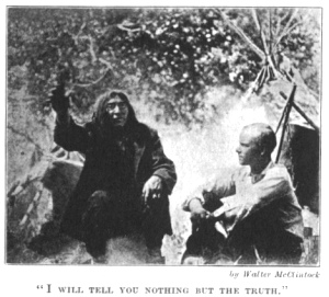 into my face for a moment, he said, "I can read a man's character in his eyes and by the look I see in his face. I know this Bull Plume is tricky, because he cannot look a man straight in the eyes. He is like a crooked stick and his words and his schemes are as many as the branches in yonder thicket. He told you that he has in his possession tribal records handed down to him from his grandfather. This is not true. Bull Plume is a young man. We do