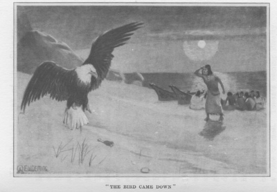 After a little time the boy went up to the beach, feeling very sad, and trying to think what he should do. At last he went into the house and took his arrows and started, walking along the shore. He walked around a point, and saw a black eagle, and shot it. He skinned it and tried to put the skin on his body, but it was too small. It did not reach down as far as his knees. He took it off and left it there and went on. After a while he saw another eagle, and he shot it, and it fell down. Its head was partly white. He skinned it and put the skin on his body, but it was too small. It reached down only a little below his knees. Then he took it off and left it lying there, and went on a long way. At last he saw a bald-headed eagle. He shot it, and it fell down. Then he skinned it and put the skin on himself. Even this was too small, but it nearly fitted him. Then he tried to fly. At first he could only fly downward. He could not rise in the air. He tried again, and this time he found that he could turn, so he kept on trying, and pretty soon he could fly well.