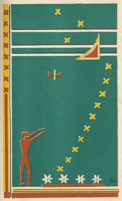 Not many weeks had passed before the chief's son fell in love with this lovely visitor from the moon. Because she fell in love with him they were married. All the tribe was happy, because the people liked them both. The women made the young man and his bride a large new wigwam painted all over with birds and animals and they made the bride some pots and bowls of clay so that she could cook for herself and her husband. The two young people made their home and were happy with each other.