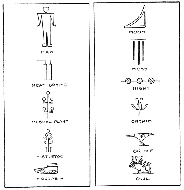 The Indians used signs or symbols to represent words. There were many of these signs; only a few are shown on the following pages. These are the symbols that the artist used in making the colored pictures.