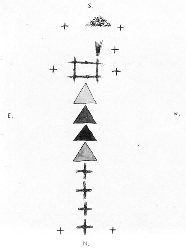 FIGURE 1. Sand painting and paraphernalia for exorcism (gray, red, blue, and yellow triangles; green crosses, frame, and grasses).