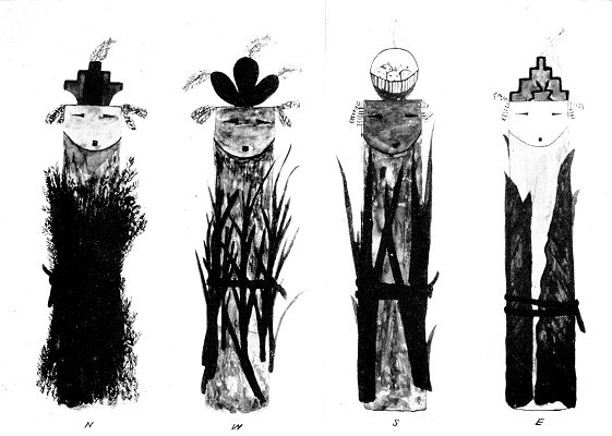 N: Spruce wood (brown; face yellow) and twigs; headdress (center black, outlined in green, sides red, top edged with green), symbol of snow for winter. W: Pine (brown; face blue); okai reeds (green) from early spring water plant; headdress (center lobe black, side lobes green), symbol of early leaves for spring. S: Fir(?) (brown, face red); cattail leaves (green); headdress, symbol of jar, clouds (face, white) and water (green) for summer. E: Aspen (gray, face white); corn leaves (green) ("the clothes"); headdress, symbol of field (red terrace outlined in black; lightning symbol in black) for fall. Turkey feathers at ears of all four prayer sticks; eagle down at top.