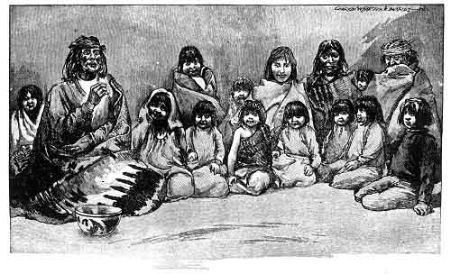 Some of us are seated on benches, and upon the floor. His back against the wall, squats my host, who is just going to begin another fairy story. Such a wee, withered, wrinkled old man! It seems as though the hot winds of the Southwest had dried him as they dry the forgotten last year's apples that shrivel here and there upon lonely boughs. He must be a century old. His children, grandchildren, great-grandchildren, and great-great-grandchildren are all represented here to-night. Yet his black eyes are like a hawk's, under their heavy brows, and his voice is musical and deep. I have never heard a more eloquent story-teller,